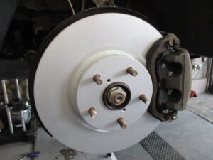 当店の国家資格整備士が、古いローターを丁寧に取り外し、お持ち込みいただいたピカピカの新品ローターとブレーキパッドを確実にお取り付けいたしました。 サビサビだった足回りが、見違えるように綺麗になりましたね!